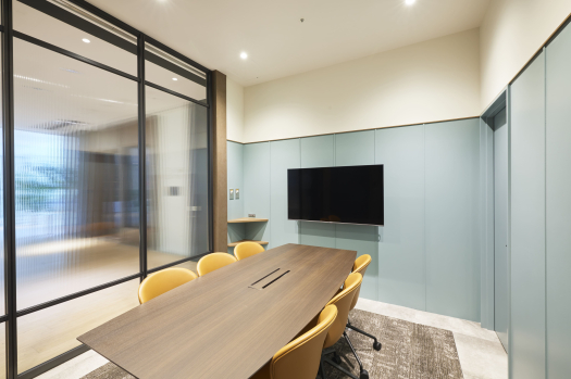 重厚感のある扉が特徴の会議室Dは、外からも中からもぼやけて見える仕様で、